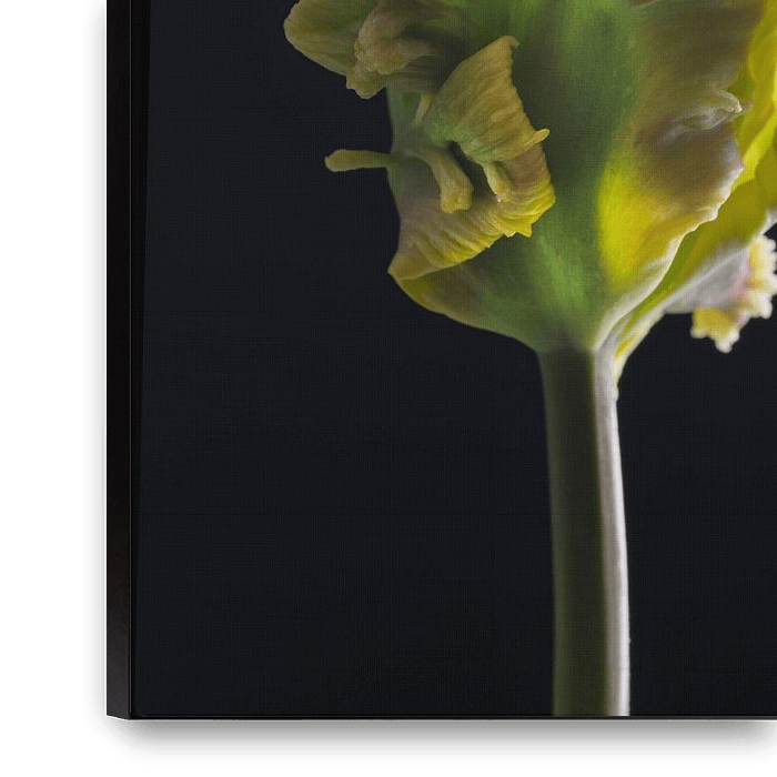Cette photo d'intérieur sophistiquée montre une tulipe perruche en train de bourgeonner. La lumière douce et les pétales transparents soulignent son élégance naturelle et son aspect frais. En tant qu'art mural, cette photographie botanique apporte lumière, optimisme et tranquillité aux intérieurs et s'intègre parfaitement aux styles de…