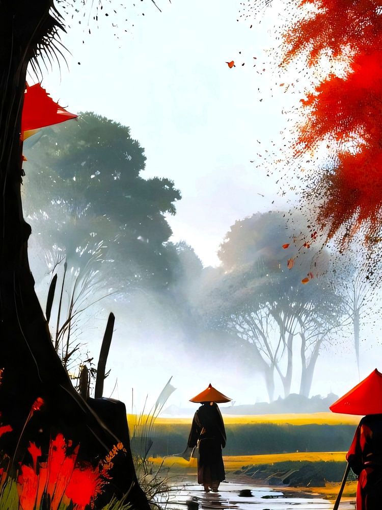 Cette œuvre d'art numérique teintée de rouge montre un moment de calme dans la campagne vietnamienne : deux personnes portant des chapeaux coniques et des robes traditionnelles traversent un ruisseau peu profond sous la cime d'un arbre rouge vif. La scène est un savant mélange de nature et de culture, noyé dans une douce brume qui adoucit les couleurs vives et confère à l'image une profondeur onirique. Des feuilles enflammées forment un contraste saisissant avec les champs dorés et verdoyants en arrière-plan et encadrent les personnages dans une étreinte paisible du paysage.