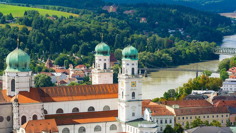 La cathédrale Saint-Étienne et le fleuve Inn avec les ponts Fünferlsteg et Kaiserin-Elisabeth-Eisenbahnbrücke.