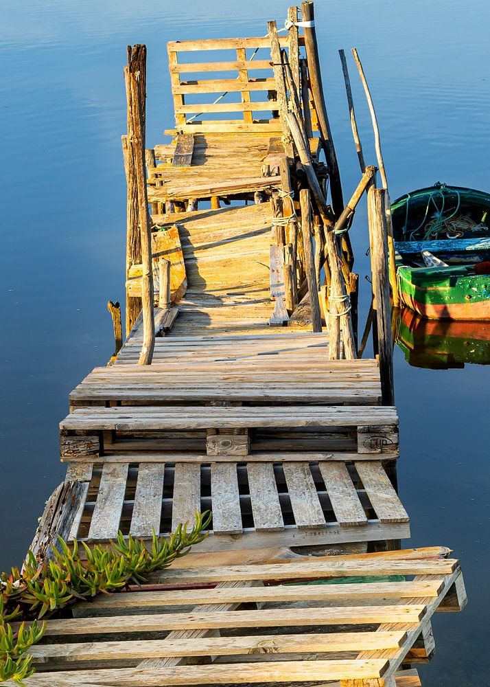 La ville de Carrasqueira se trouve sur la lagune créée par le ruissellement du Rio Sado. Autrefois, les pêcheurs construisaient eux-mêmes toutes sortes de jetées et de passerelles délabrées pour accéder à leurs bateaux. Le résultat est un enchevêtrement de poteaux et de planches, et dans l'ensemble une vue très agréable et pittoresque. Cette photo a été prise à l'heure dorée, juste avant le coucher du soleil.