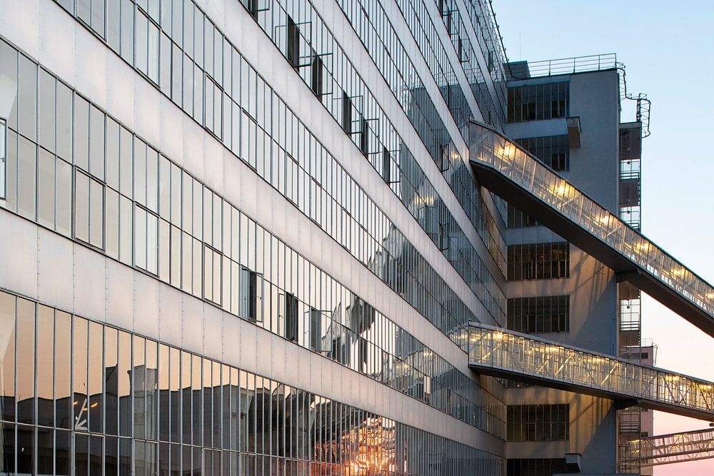 Site industriel inscrit au patrimoine de l'Unesco, l'usine Van Nelle à Rotterdam, au crépuscule.
