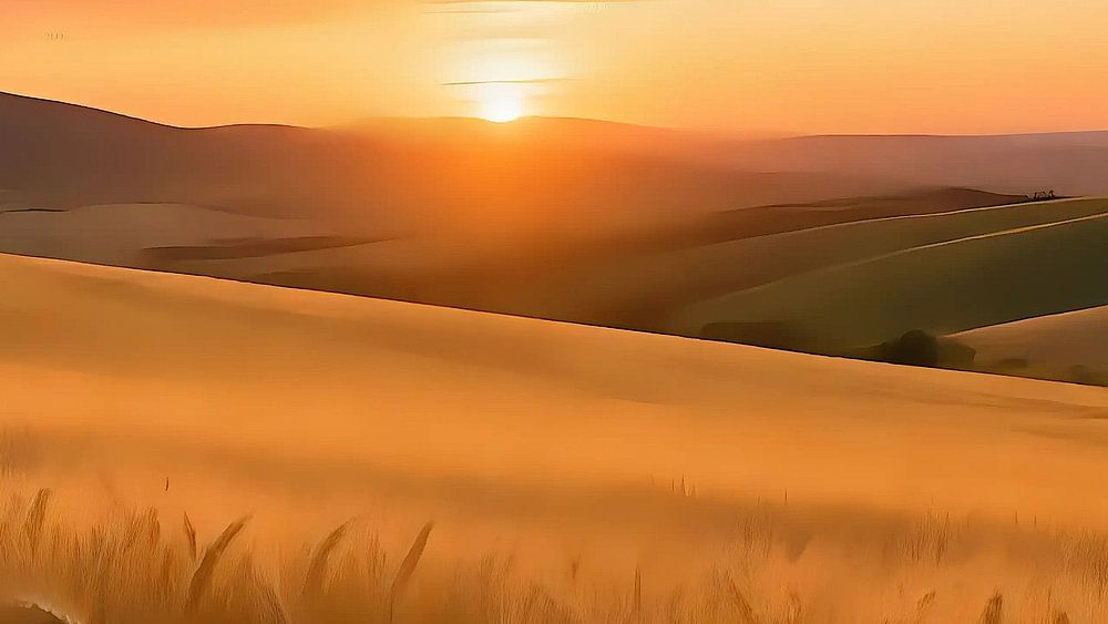 Un champ de blé qui semble infini s'étend jusqu'à l'horizon comme un océan doré, chaque brin scintillant finement dans la chaude lumière du soir. Les épis se balancent doucement dans le vent de fin d'été, produisant un léger bruissement apaisant qui rappelle le ressac de la mer. Le sol est fertile et sombre, à certains endroits se dessinent d'étroits sentiers que les moissonneurs emprunteront à l'avenir. En bordure du champ se dressent quelques arbres noueux dont les silhouettes donnent de la profondeur à l'image et offrent un abri aux couples d'oiseaux qui se préparent pour la nuit.
