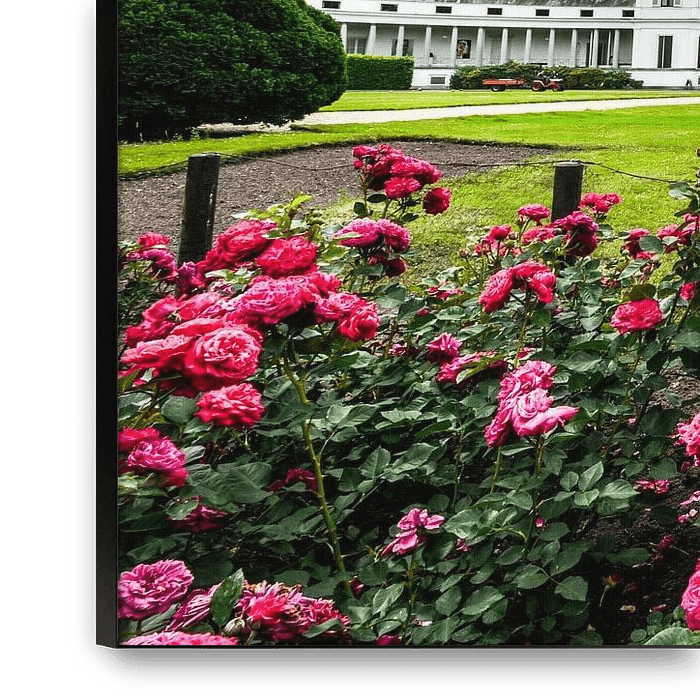 Je suis en route pour un client d'Utrecht, en direction de l'Utrechtse Heuvelrug. Ma route passe devant le château de Soestdijk, dont la façade majestueuse s'élève derrière un champ de roses en pleine floraison. Les fleurs forment un contraste coloré avec le ciel sombre qui s'élève au-dessus des arbres.