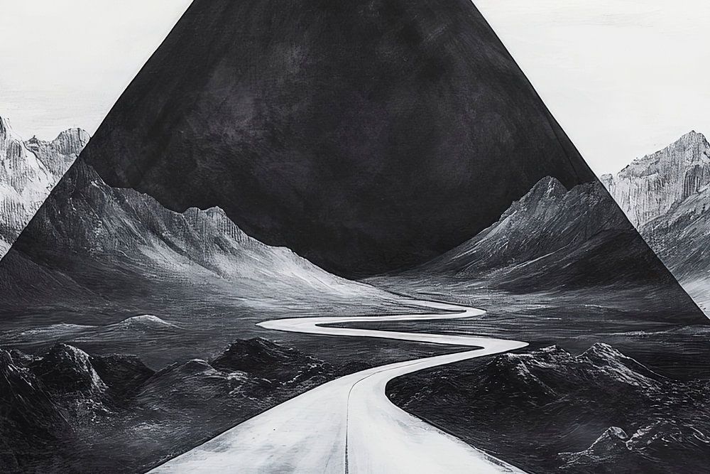 Un jeu impressionnant de formes géométriques et de nature majestueuse nous entraîne dans un paysage mystérieux. Le cadre pyramidal noir marquant contraste parfaitement avec les douces nuances de gris des montagnes et la route sinueuse qui laisse espérer l'aventure. Choix idéal pour le salon afin de favoriser les conversations et les pensées inspirantes.