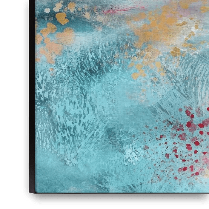 La combinaison de turquoise, de bleu clair, de corail, de jaune pâle et de touches de rouge rend cette œuvre polyvalente et facile à intégrer dans un intérieur.