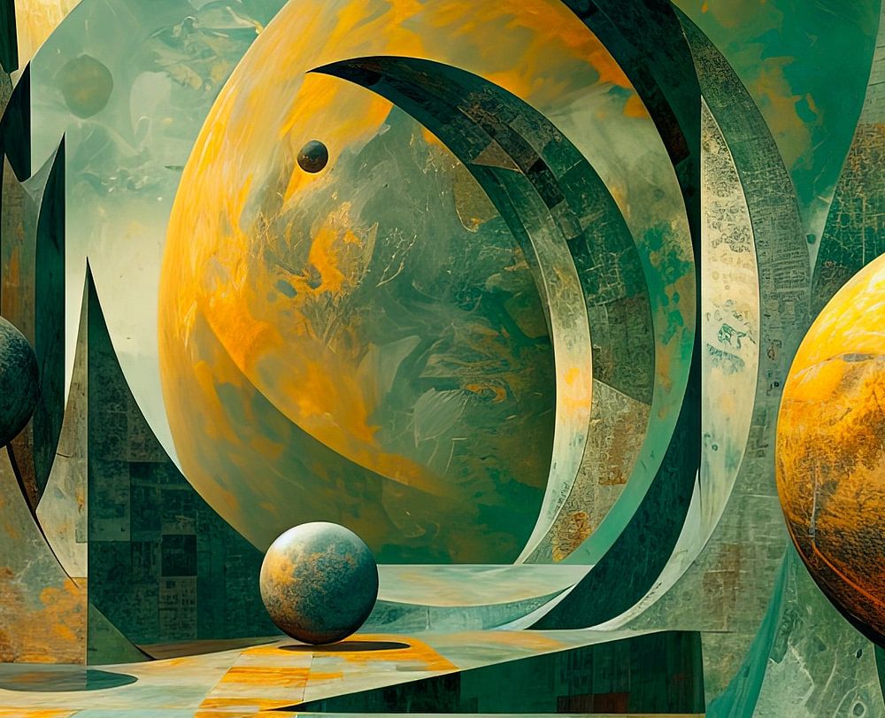 Paysage abstrait avec des globes et des figures serrées avec de belles textures et de la profondeur. Dans les tons jaune orange vert. Travail numérique utilisant AI et édité dans photoshop.