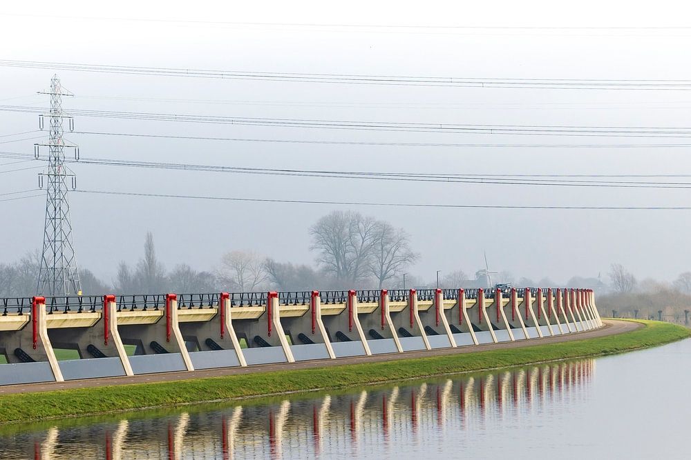 Le barrage de protection contre les inondations, aux couleurs magnifiques, se cache dans le Rhin inférieur près de Wageningen et se reflète dans l'eau. Les poteaux électriques à l'arrière-plan semblent perturber l'image mais la complètent en un paysage architectural énergique.