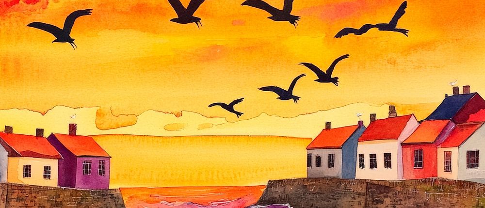 S'immerger dans les couleurs chaudes d'un coucher de soleil, tandis que les oiseaux survolent des maisons pittoresques et colorées. La surface miroitante de l'eau et les douces collines créent une atmosphère harmonieuse. Cette œuvre d'art ajoute une touche apaisante et accueillante à n'importe quel salon et évoque des souvenirs d'excursions côtières et de soirées relaxantes. Parfait pour des conversations confortables.