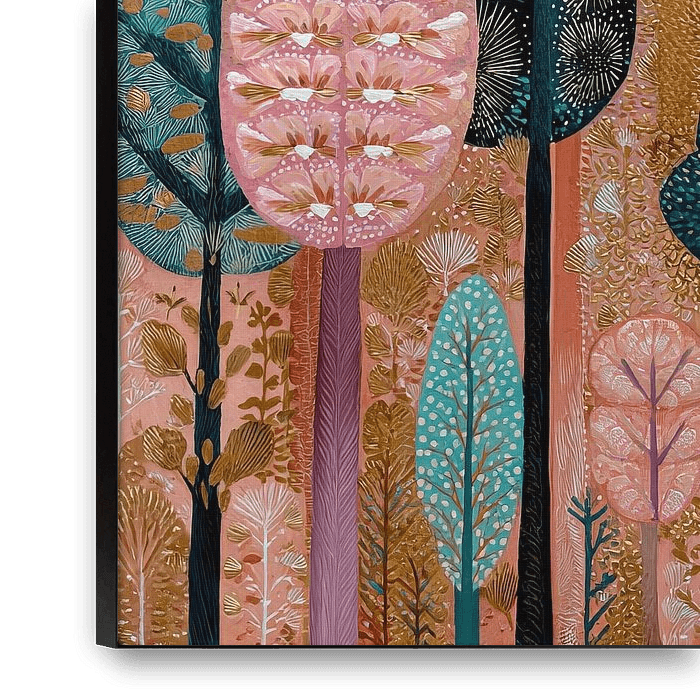 Paysage d'arbres - Étreinte vibrante de la nature - Cette peinture colorée montre un paysage imaginatif d'arbres avec un mélange ludique de feuilles dorées et de couleurs vibrantes, créant une atmosphère joyeuse et invitante.