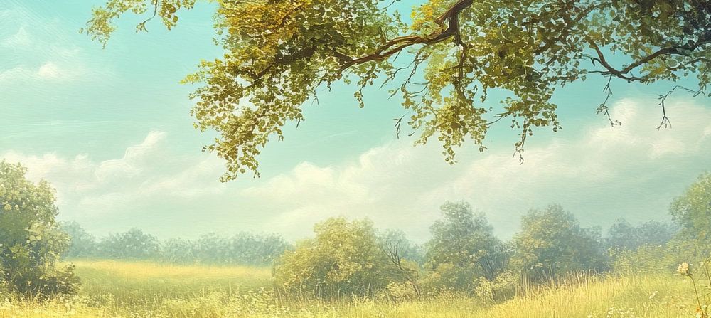 Paysage d'arbre - Cette peinture de paysage montre un grand arbre aux feuilles vertes s'étendant sur un champ vallonné aux nuances de jaune et de vert, sous un ciel bleu clair avec de légers nuages.