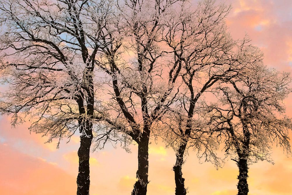Paysage d'hiver avec 4 arbres solitaires et une légère neige, réalisé dans les environs de Coevorden, Drenthe.