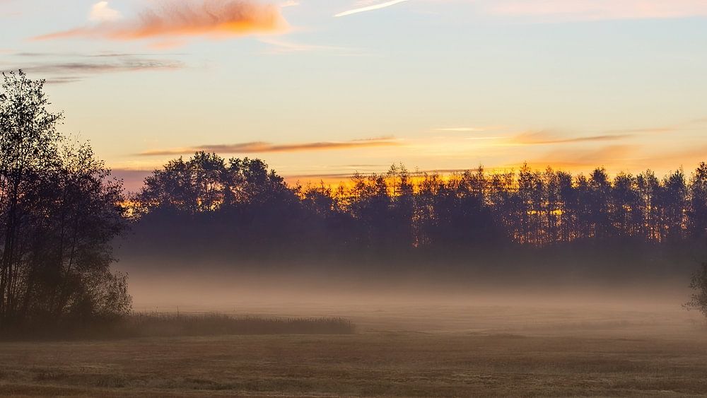 La photo a été prise au coucher du soleil. Le soleil colore les nuages et le paysage est de plus en plus brumeux.