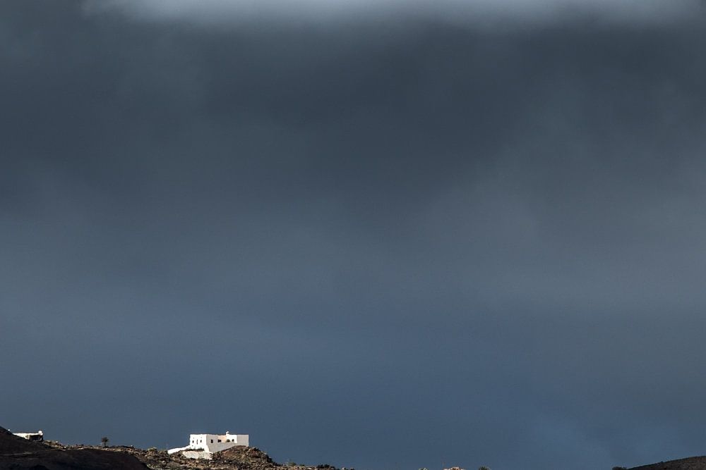 Dans un ciel bien couvert, un petit nuage est néanmoins éclairé par un faisceau lumineux clairsemé qui éclaire également la seule maison blanche du paysage.