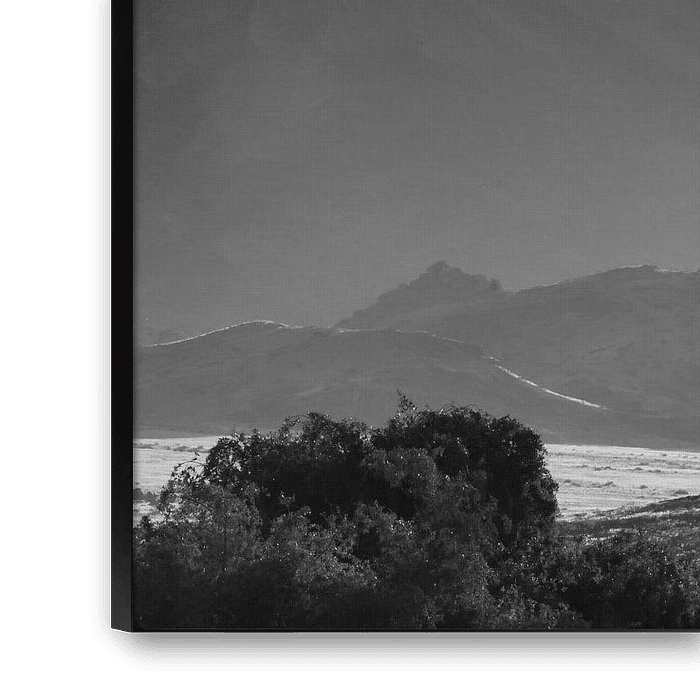 Un paysage en noir et blanc en fin de journée. Il se compose de dunes et d'arbres qui deviennent de plus en plus flous au fur et à mesure qu'ils s'éloignent. Plus près, un groupe d'arbres forme une silhouette sur les dunes au loin.