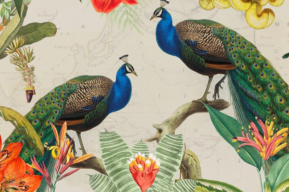 Imaginez un tableau vintage luxueux au format horizontal qui transporte le spectateur dans une jungle tropicale avec des feuilles de palmiers luxuriantes, des fleurs exotiques orange BL, des feuillages vifs et des oiseaux paons exotiques au milieu d'un paysage verdoyant. La scène, dans un schéma de couleurs sépia-argenté, rayonne d'une…