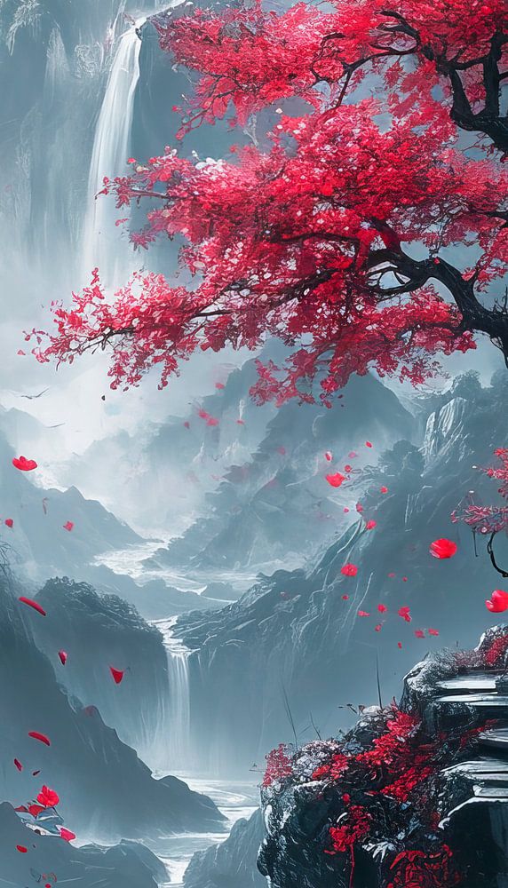 Un arbre en fleurs dans un paysage de montagne brumeux dans une version aux tons cramoisis et gris dans le style de la peinture japonaise classique.
