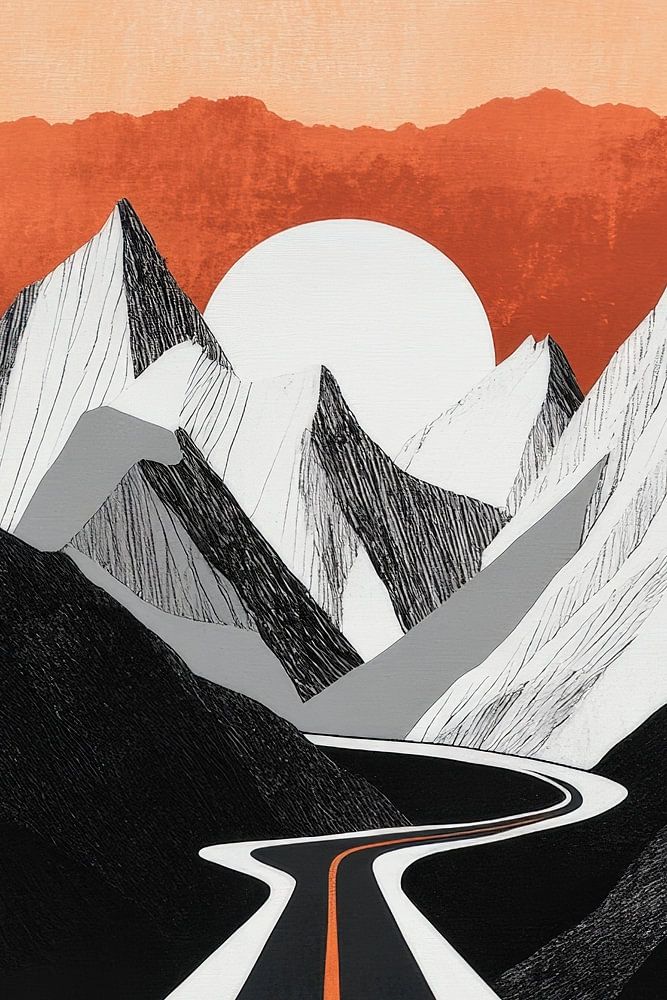 Un jeu vibrant de formes géométriques et de tons terreux entraîne le spectateur sur une route sinueuse à travers des montagnes majestueuses vers un coucher de soleil radieux. Ce paysage stylisé crée une atmosphère apaisante et convient parfaitement à la chambre à coucher, où il favorise la détente et l'inspiration.