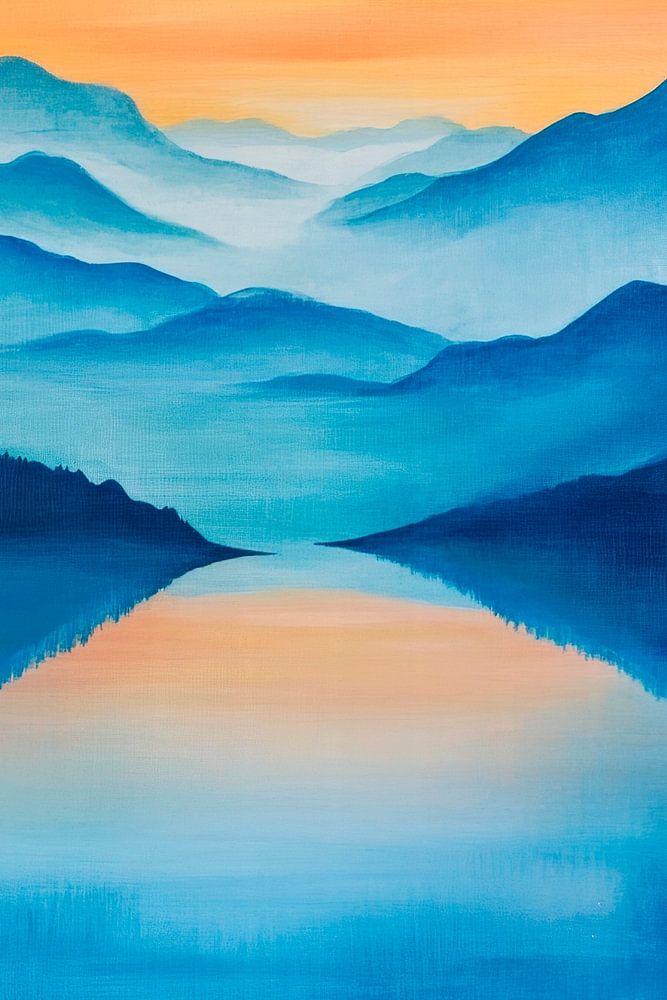 De douces silhouettes de montagnes se fondent dans une eau calme et miroitante, créant une atmosphère harmonieuse. Le coucher de soleil chaud apporte des accents vifs d'orange et de bleu qui invitent à la rêverie. Idéal pour le salon, où ce décor paisible favorise les conversations relaxantes et les pensées créatives.