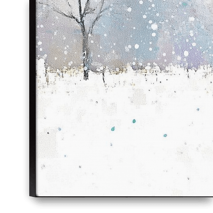 Techniek en sfeer: het schilderij balanceert tussen impressionistische aanrakingen en lichte abstractie. De sneeuw is opgebouwd uit brede witte velden met speldenprikjes en spatten; de sneeuwvlokken zijn zichtbaar als losse, bijna pointillistische stippen die over het hele doek zijn verspreid. De keuze voor sterk contrast tussen het rustige witte veld en het kleuraccent van het huis creëert warmte en heimwee binnen een koude setting — een winter schilderij dat tegelijk troostend en afstandelijk voelt. Door de subtiele kleuren in de achtergrond en de rustige compositie ontstaat er ademruimte: het landschap nodigt uit tot blijven kijken en vertragen.