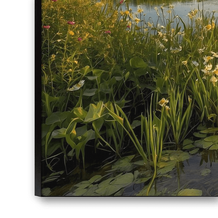 Ce magnifique paysage d'été montre une scène sereine et pittoresque, pleine de couleurs et de vie. Les vastes champs verts et les fleurs qui fleurissent au bord de l'eau donnent une impression de tranquillité et de beauté naturelle. La surface calme de l'eau reflète le ciel bleu clair et les nuages qui s'élèvent doucement, créant une atmosphère presque magique. Cette œuvre d'art est parfaite pour tous ceux qui aiment la nature et la beauté du plein air. Il peut être ajouté à n'importe quelle pièce, en particulier celles où l'on souhaite créer un sentiment de calme et de relaxation. Ce dessin capture l'essence d'une journée d'été dans toute sa gloire.