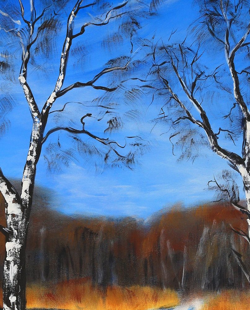 Paysage d'hiver avec des bouleaux est une peinture acrylique au format vertical réalisée par l'artiste Karen Kaspar. Un sentier couvert de neige traverse une prairie et passe devant trois bouleaux avant d'entrer dans une forêt. Les herbes sèches jaunes et brunes de la prairie émergent de la neige blanche. Les bouleaux s'élèvent haut dans le ciel. L'écorce blanche des troncs et des branches se détache sur la forêt d'hiver sombre et dénudée et sur le ciel d'un bleu éclatant. La scène dégage une atmosphère calme, détendue et paisible.