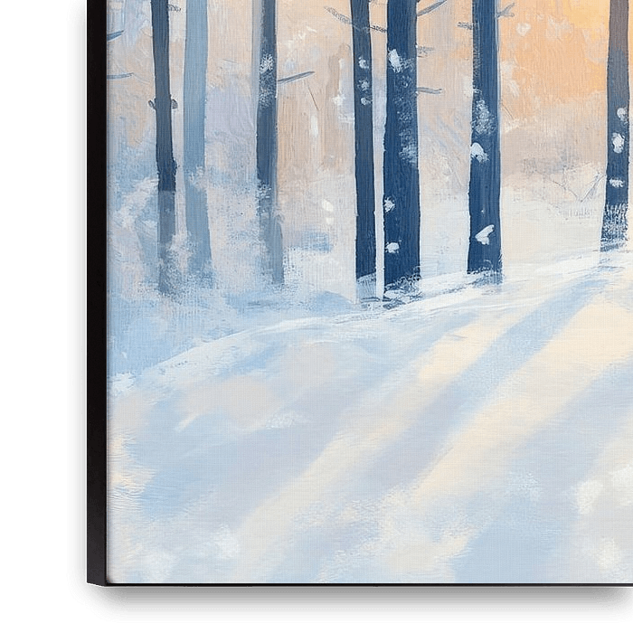Dans un paysage hivernal enchanteur, où la neige douce embrasse le sol, deux chevreuils timides percent le silence chatoyant. La lumière dorée derrière les arbres confère à la scène une ambiance magique. Cette œuvre d'art apporte calme et harmonie dans le salon et invite à la rêverie.