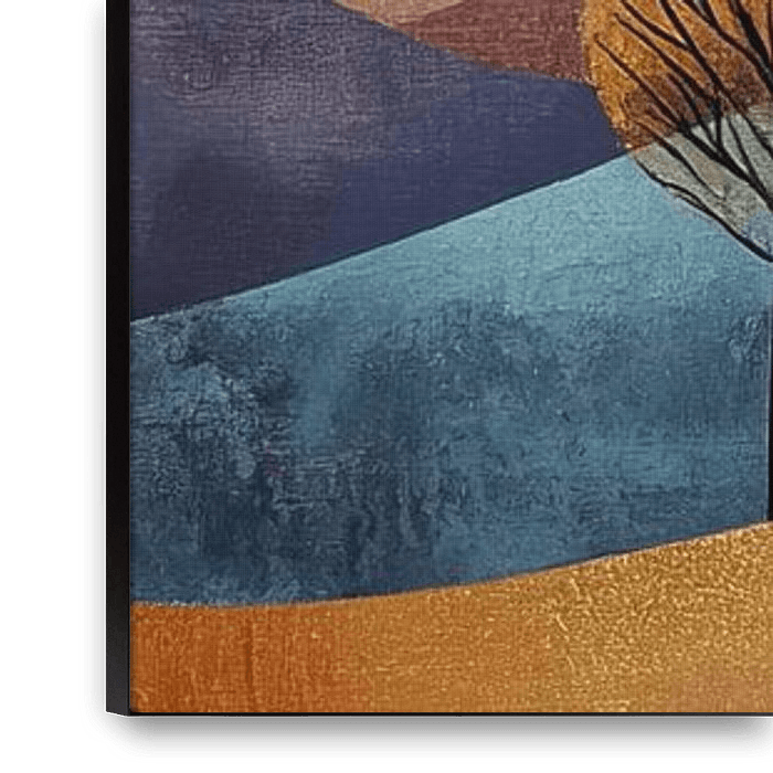 Détails : peinture abstraite, paysage moderne, collines, arbres, nature abstraite, art, galerie, art moderne, peinture de paysage, art décoratif Couleurs : bleu, violet, or