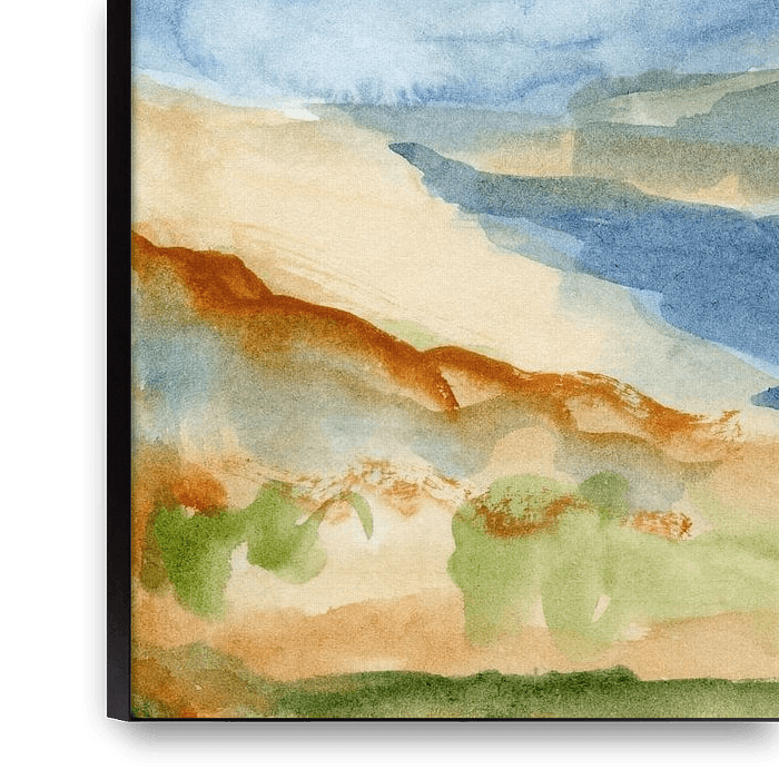 À propos de ‘Paysage moderne abstrait en aquarelle. Bleu, vert, terre.’ par Dina Dankers