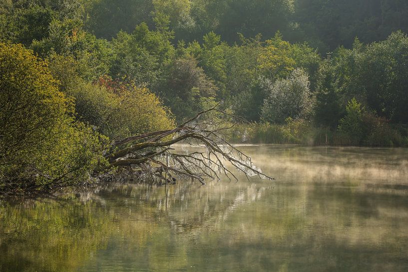 Paysage riverain des lacs de Schwackenreut près de Mühlingen avec les derniers restes de brouillard au-dessus de l'eau