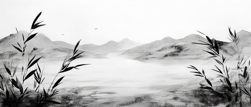 La douce rivière, encadrée de délicats roseaux, invite à un voyage méditatif dans la nature. Les douces collines en arrière-plan et la palette de couleurs monochromes dégagent calme et harmonie. Parfait pour la chambre à coucher, il crée une atmosphère relaxante qui invite à une retraite réparatrice.