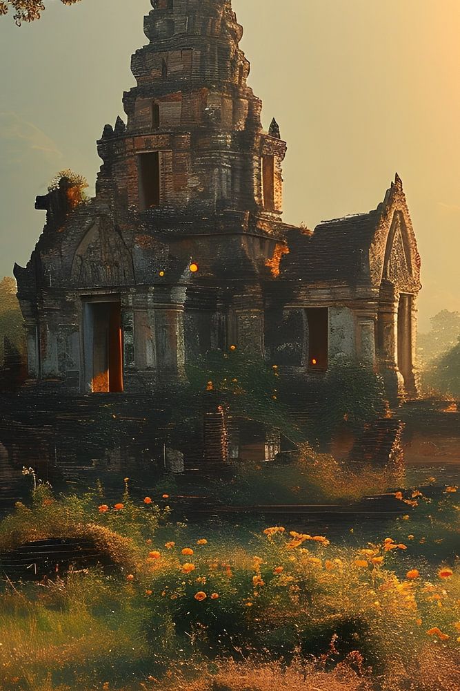 L'image montre un paysage thaïlandais idyllique avec un ancien temple en ruine. Au premier plan s'étend une vallée verdoyante entourée de hautes montagnes. Les ruines du temple s'élèvent majestueusement vers le ciel et dégagent une atmosphère spirituelle. La scène évoque le calme et la paix et invite à découvrir la beauté de la culture thaïlandaise.