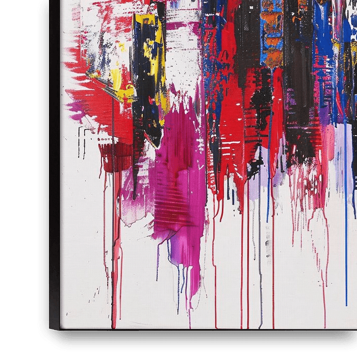 Cette peinture unique est une représentation colorée et abstraite d'une ville sur un fond blanc. Les couleurs vives rouge, bleu, noir, jaune et blanc sautent de la toile, créant une image dynamique et énergique. Parfaite pour les intérieurs modernes, cette œuvre d'art ajoute une touche de créativité et de style à n'importe quel espace.…