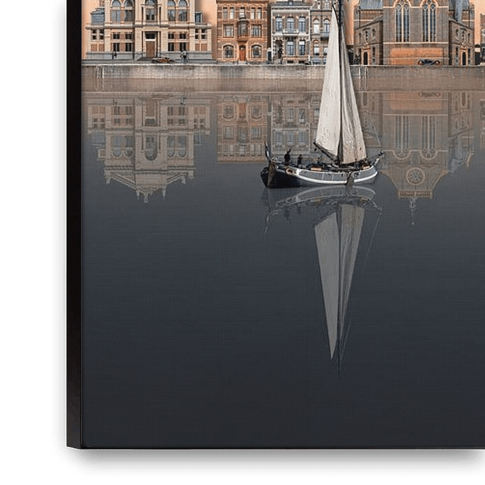 Les bâtiments de la ville ont été photographiés individuellement, puis rassemblés en une seule image. Le reflet dans l'eau ajoute de la puissance au paysage urbain.