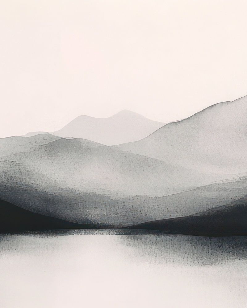 Un paysage serein et minimaliste, exécuté dans des tons d'aquarelle doux, montre des collines ondulantes disparaissant dans un lointain brumeux. La composition calme et l'utilisation subtile de la couleur font de cette pièce un objet parfait pour un intérieur qui veut respirer le calme et la clarté. Cet imprimé est le reflet du style japonais : un mélange harmonieux de minimalisme scandinave et de zénitude japonaise. Idéal pour les chambres à coucher, les salles de yoga ou les salons minimalistes.