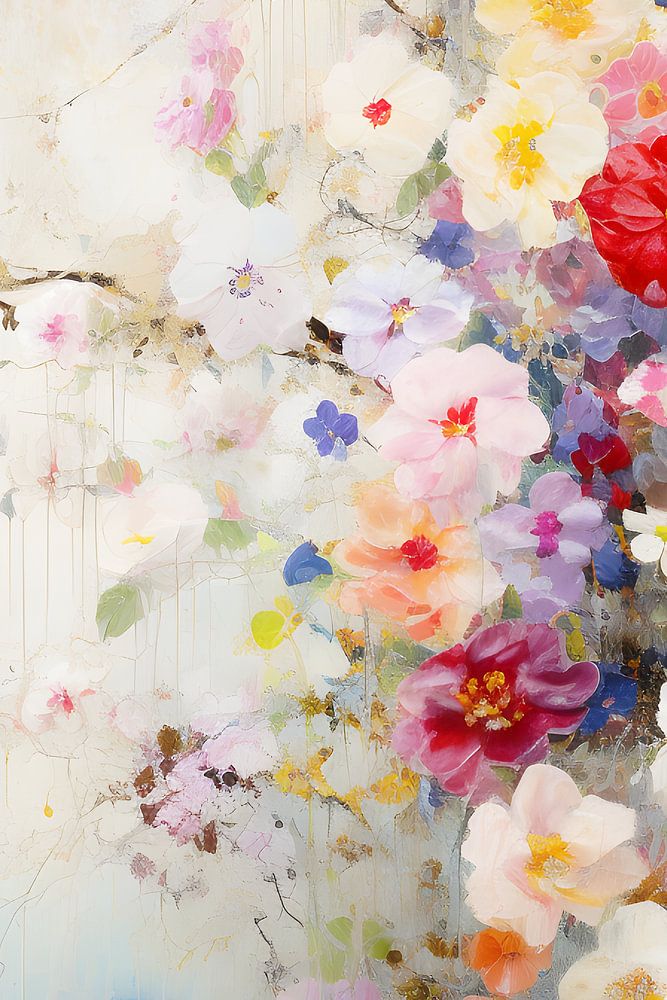 Peinture abstraite avec des fleurs de différentes couleurs, fond bleu. Art botanique.