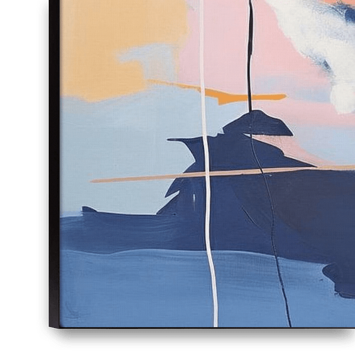Abstrait Peach Fuzz - Cette œuvre abstraite combine de douces couleurs pastel avec des accents de Peach Fuzz dans un jeu vibrant de formes et de contre-couleurs. Des zones bleu foncé et blanches équilibrent l'ensemble, tandis que des lignes délicates ajoutent une dynamique subtile.
