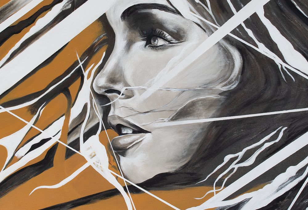 Belle peinture acrylique, "Stripes woman". Portrait d'une femme, au regard dur et pénétrant, dans un enchevêtrement de rayures aux belles couleurs naturelles. Ce tableau est peint à la main et peut être commandé dans n'importe quelle taille et n'importe quel matériau ! Un bel accroche-regard pour vous comme décoration murale.