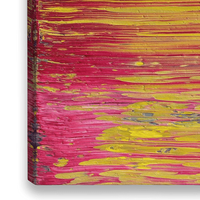 Peinture à l'huile abstraite, avec des bandes horizontales dans différentes nuances de jaune, de rose, de violet et un soupçon de bleu. Ces couleurs sont vibrantes mais harmonieusement combinées. L'utilisation de transitions douces entre les couleurs crée une atmosphère vivante mais sereine.