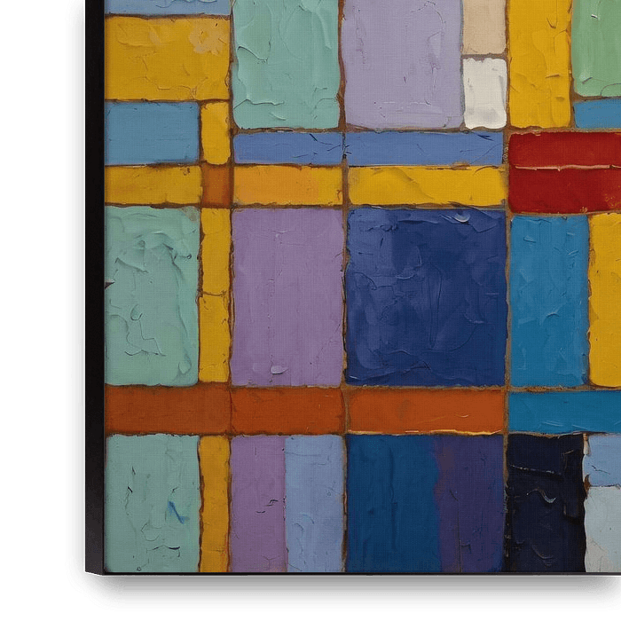 Cette peinture abstraite est une composition captivante de rectangles et de lignes, inspirée du célèbre style de Piet Mondrian. Les couleurs vives, telles que le rouge, le jaune et le bleu, créent un design dynamique et vibrant qui s'intègre parfaitement dans un intérieur moderne. La simplicité des formes géométriques combinée à la…