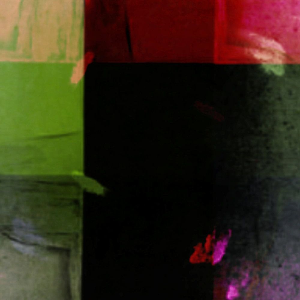 Peinture abstraite, construite en combinant plusieurs couches dans des couleurs chaudes : rose, jaune, vert et bleu dans différentes nuances.