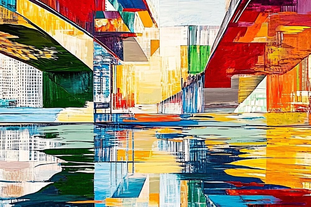 Cette œuvre d'art colorée et vibrante montre une représentation abstraite de ponts dans un environnement urbain. Le mélange de couleurs vives telles que le jaune, le rouge, le bleu et le vert apporte de l'énergie et du dynamisme à tout intérieur. Parfait pour les espaces modernes, tels que le salon ou le bureau, il apporte une touche artistique. Le reflet des ponts sur l'eau ajoute de la profondeur et crée une composition visuelle intéressante. Cette création unique est idéale pour les amateurs d'art qui aiment l'art moderne et abstrait et qui veulent faire une déclaration avec leur décoration d'intérieur.