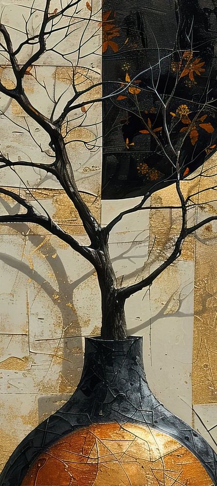 Détails : abstrait, nature morte, hiver, or, noir, arbre, nature, couleurs froides, accents chauds, texture