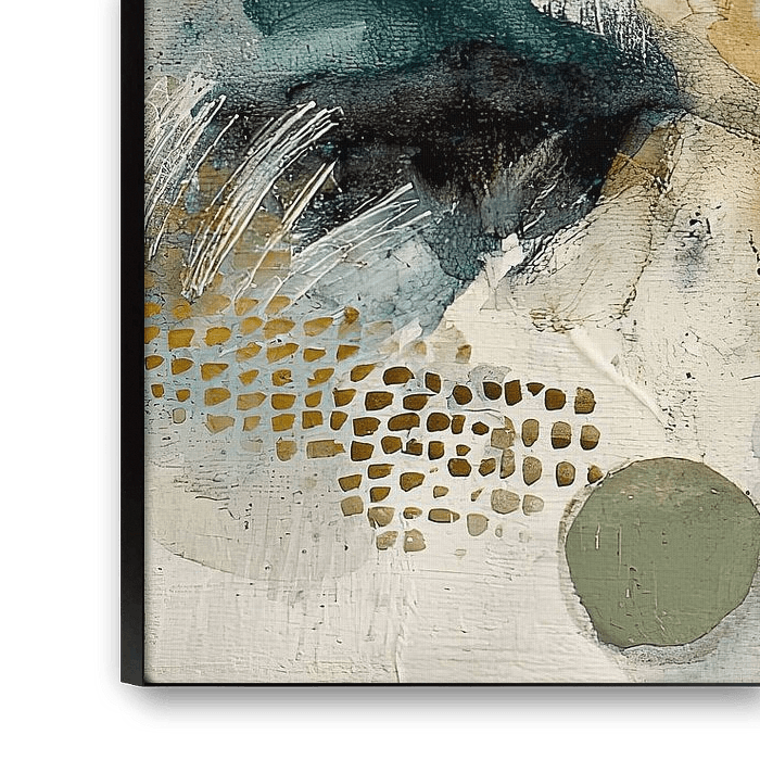 Peinture abstraite en vert sauge doux avec beige lin, points organiques et échos de feuilles. Résistant au Japon et hautement combinable, inclinable.