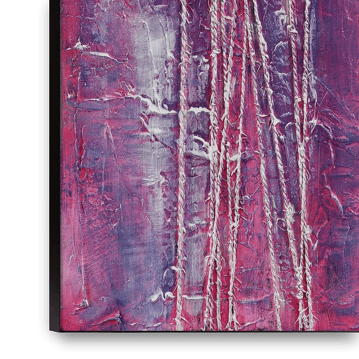Peinture abstraite avec un mélange de textures et de couleurs. La partie gauche du tableau présente des lignes verticales en argent, blanc et rose, tandis que la partie droite se compose principalement d'un mélange de tons violets et roses avec une finition rugueuse et texturée. Les couleurs se fondent les unes dans les autres, créant une image dynamique et vibrante.