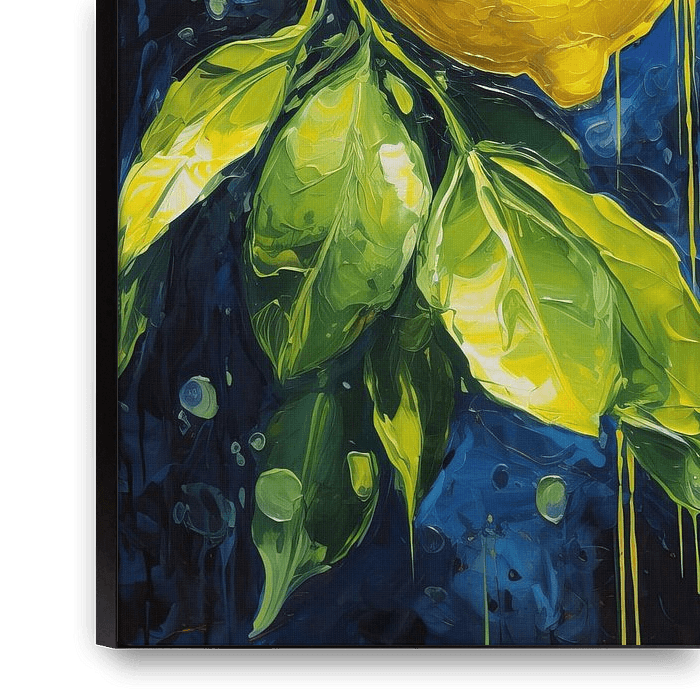 Au centre de ce tableau se trouve un citron étincelant, représenté dans des tons jaunes intenses qui contrastent avec l'arrière-plan sombre en noir et bleu profond.