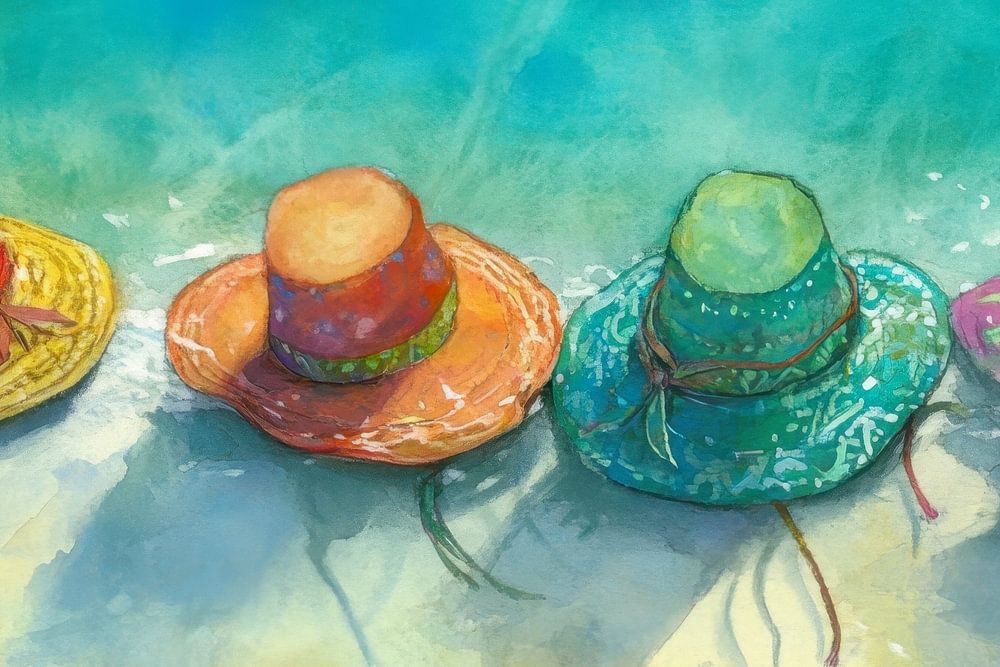 Peinture représentant quatre chapeaux colorés posés sur la plage, juste au bord de l'eau. Les couleurs des chapeaux sont le jaune, l'orange, le vert et le violet, chacun avec des motifs et des décorations uniques. L'arrière-plan est constitué d'une mer bleue claire avec des rayons de soleil qui brillent à travers l'eau, pour une atmosphère sereine et estivale.