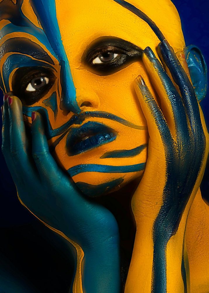 Un portrait puissant et surréaliste qui explore l'identité et l'émotion à travers une peinture corporelle audacieuse. Le modèle est peint en jaune vif et bleu profond, créant un contraste visuel dramatique qui symbolise la dualité et la tension intérieure. La pose expressive et le regard perçant évoquent un sentiment de vulnérabilité, de force et de transformation artistique.