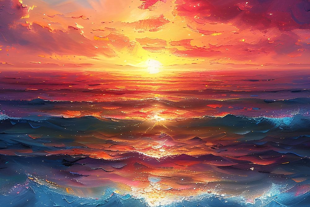 Découvrez l'époustouflante "Peinture Coucher de soleil sur la mer" ; une œuvre d'art qui capture la beauté sereine d'un coucher de soleil sur un océan calme.