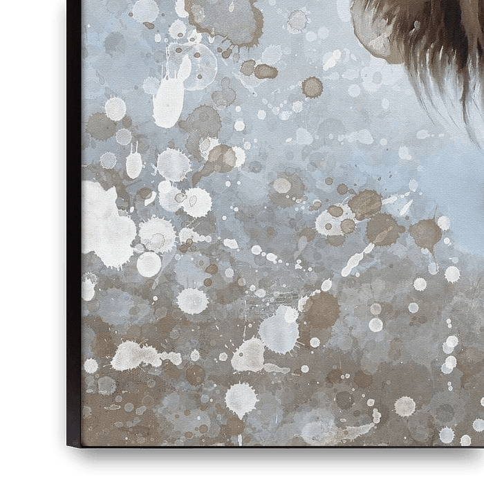 Un highlander écossais, regardant la plaine. La grande et belle bête, qui regarde à droite du tableau. À gauche et à droite, on voit ici et là des plantations abstraites dans des tons bruns doux, devant un ciel blanc chaud, bleu et caramel. La bête encombrante, avec ses belles et longues mèches, prend une allure poétique dans cette composition. Calme dans l'atmosphère. D'apparence ludique. Douceur d'exécution.