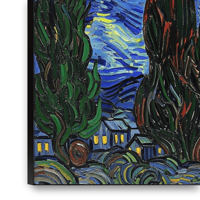 Une peinture de paysage stylisée et vibrante présentant un ciel nocturne étoilé tourbillonnant au-dessus d'une petite ville et des cyprès sombres bien visibles au premier plan.